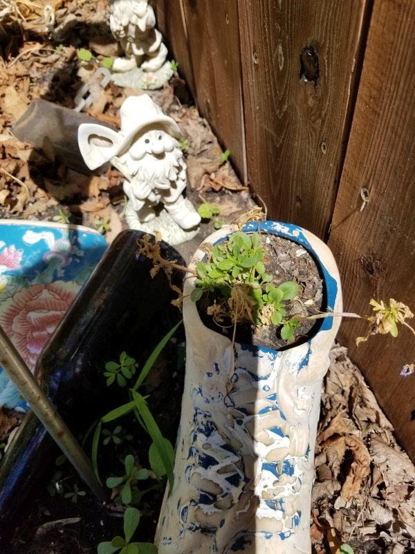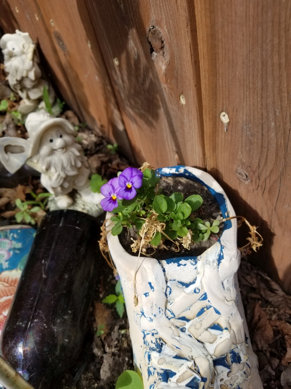 The shoe viola is budding! The shoe viola is budding! It is NOT a weed! It came back from the dead like plant Jean Grey!