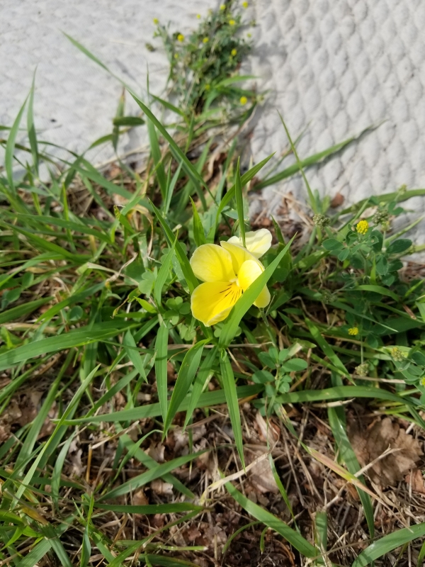 A feral pansy! Yes, a pansy has sprouted in the yard.