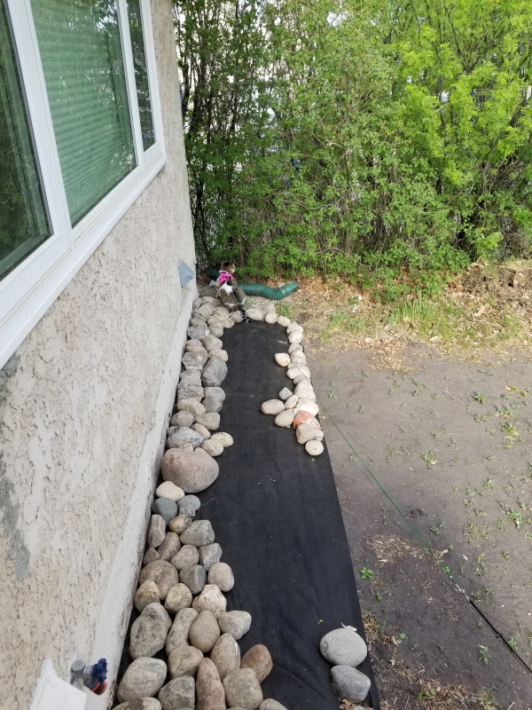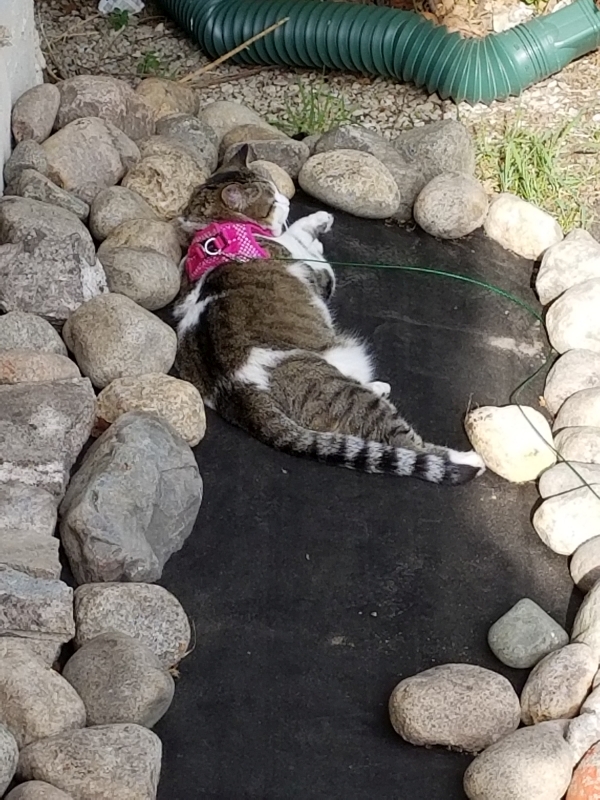 Not a lot of changes in the garden today - at this point we were still moving the plants in and out of the house due to sudden cold temperatures. However a certain little cat approves of the rock garden.