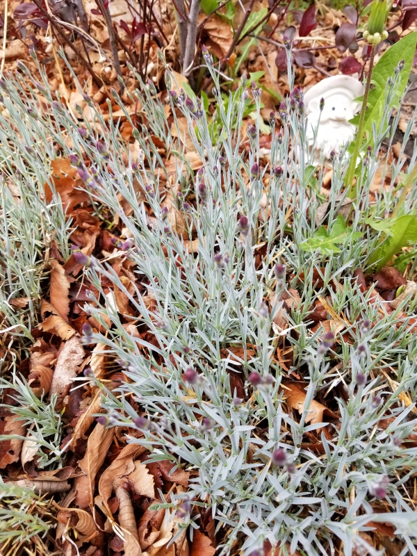 We have no idea what this is. It has been here since we arrived. It is a mystery plant. It, too, is budding. 2021/06/02: The mystery plant has been identified! It is a dianthus!