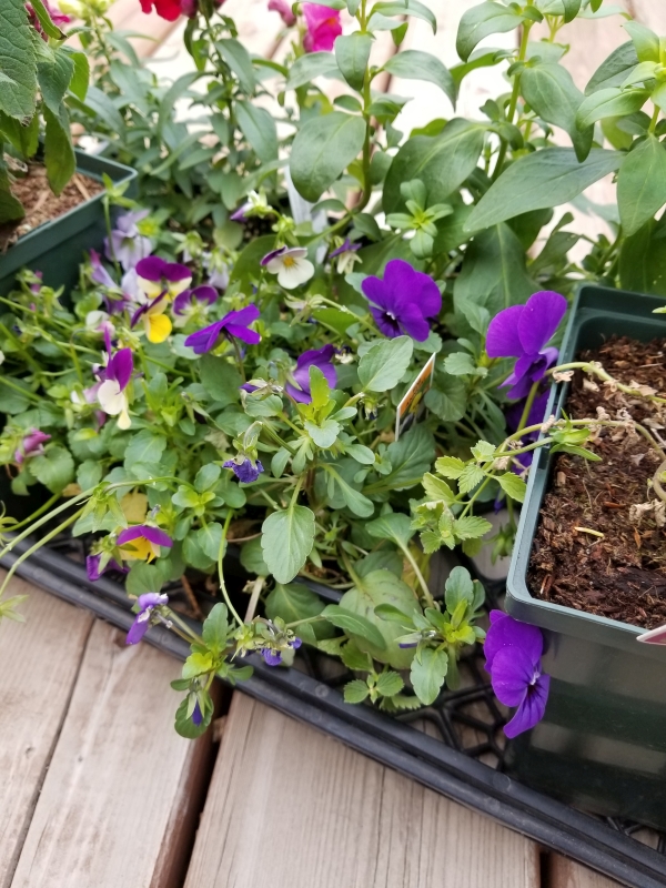 And the last (photographed, there were geraniums, dill, more types of lavender, and other mints) gem, the sweet little violas which at one point got sat on by a rabbit.