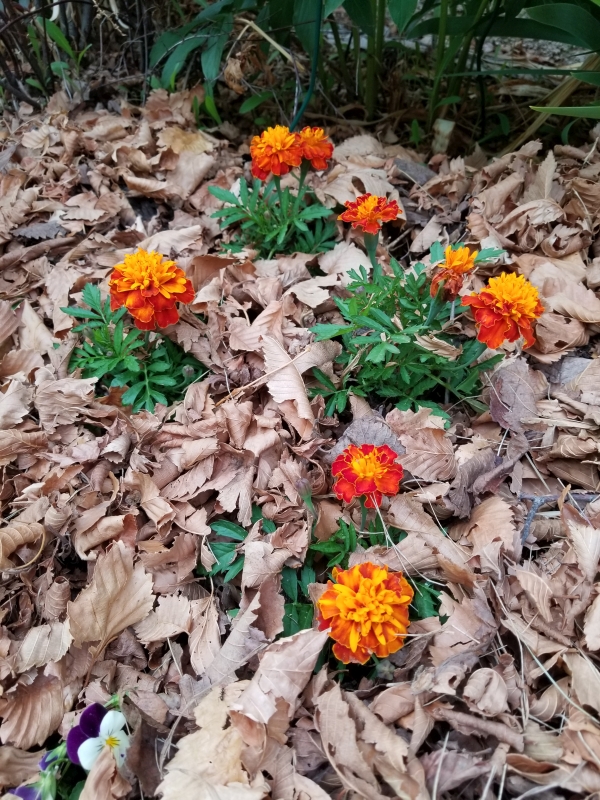 The marigolds have been real champions in this heat. It looks a little autumny with those leaves and their orange and yellows.