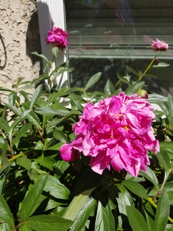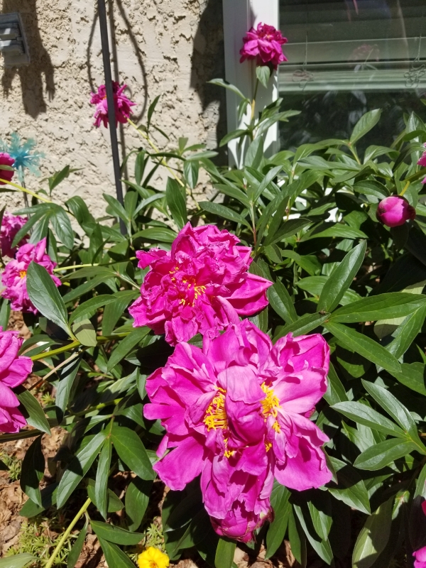 The first round of peonies is fading, but new buds are already starting to appear. The bright yellow stamens that are appearing with the falling leaves is a nice treat.