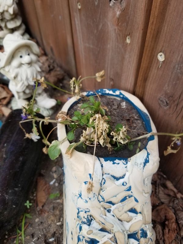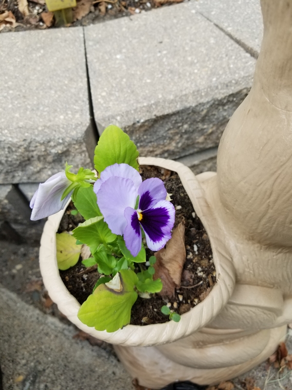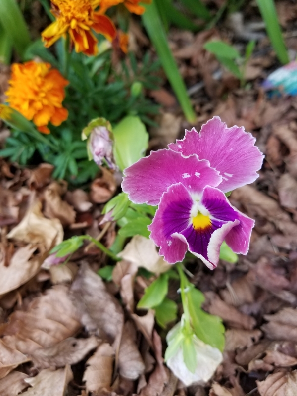 The new pansy bud has taken on the vibrant purple of the old, which now passes from this world.