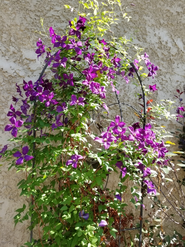 A pansy challenges the clematis for winner of the pretty purple garden flower contest.