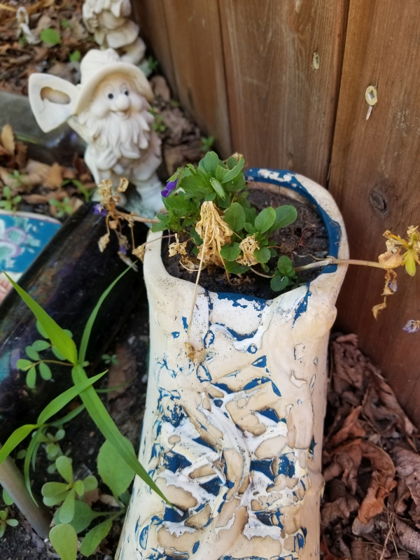 The shoe viola is budding! The shoe viola is budding! It is NOT a weed! It came back from the dead like plant Jean Grey!